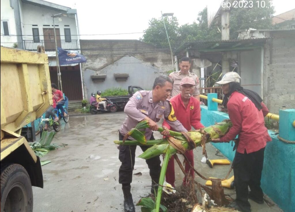 Mengantisipasi adanya genangan air maupun banjir saat hujan, Aiptu M. Soleh Bhabinkamtibmas Kelurahan Pondok Kacang Timur Polsek Pondok Aren bersama warga masyarakat membersihkan sampah.