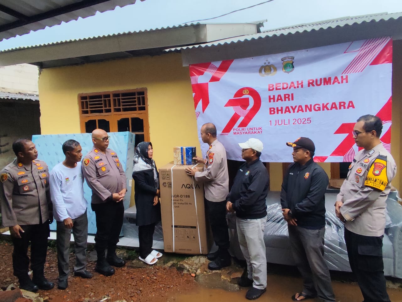 Pada Sabtu (28/6), Kapolres Tangerang Selatan Akbp Victor D.H. Inkiriwang, S.H., S.I.K., M.Si. melalui Kabag Log Kompol Evarmon Lubis, S.H., M.M., menyerahkan secara simbolis sejumlah perlengkapan rumah tangga kepada pemilik rumah. Penyerahan dilakukan bersama Kapolsek Legok AKP Dikie Wahyudi, S.H.
