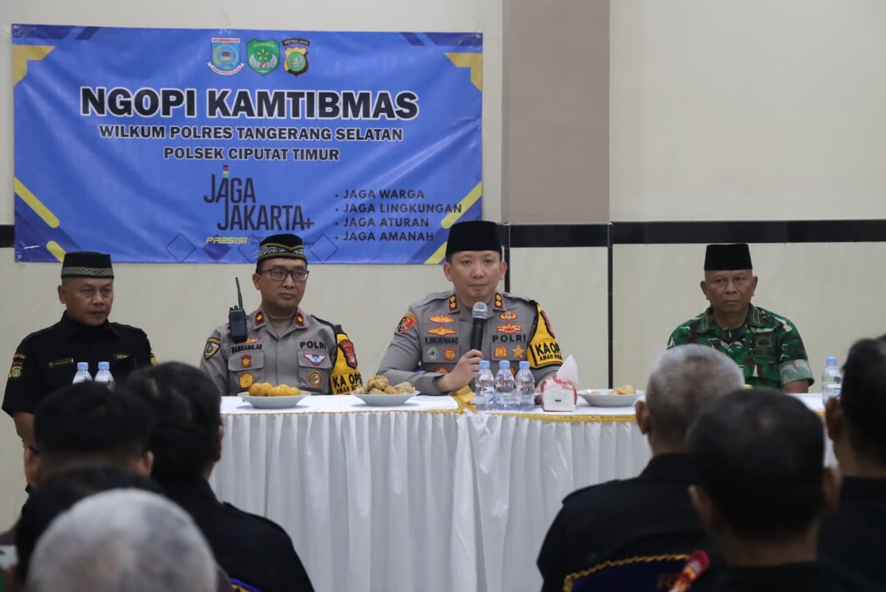 Polres Tangsel – Polres Tangerang Selatan menggelar kegiatan Pembinaan Potensi Masyarakat (Potmas) dan Ngopi Kamtibmas bersama Sentra Komunikasi (Senkom) Mitra Polri Kota Tangsel di Gedung Serba Guna Perum Serua Barokah, Kelurahan Serua, Kecamatan Ciputat Timur, Selasa (7/10/2025).