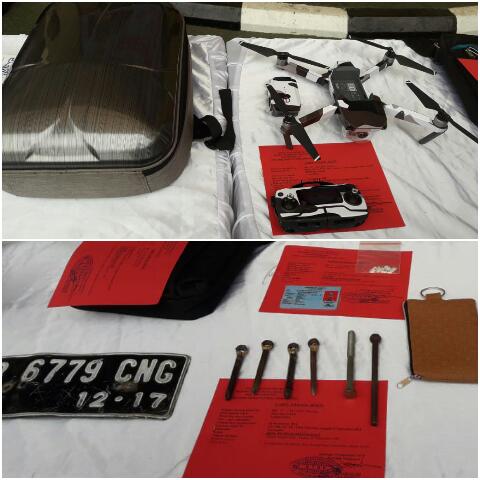 Dari kedua pelaku diamankan barang bukti berupa 1 (satu) buah tas abu-abu merk MAVIC yang berisikan 1 unit Drone DJI MAVIC PRO warna Silver dengan serial number 08QDE2NO1204G2, Pecahan kaca mobil Daihatsu Ayla B-1025-CMJ, 5 (lima) Buah mata besi, Pecahan keramik Busi dan 1 unit sepeda Motor B-6779-CNG merk Honda Beat Warna Hitam.