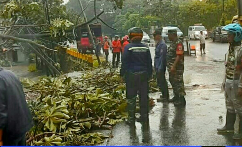 Tangerang Selatan, Bhabinkamtibmas Kel. Cilenggang dan Bhabinsa Aiptu Helmy Budiman Polsek Serpong bersama Babinsa Cilenggang Serka Uji Setya Laksmono, Serka Sugeng dan Bp. Hotman Sugiarto ( Ketua RT 006/02 ) mendapatkan laporan warga masyarakat An.Ibu Dillah bahwa ada pohon tumbang akibat hujan disertai angin kencang yang menimpa bangunan kios dapur rumah makan Padang yang saat ini digunakan untuk pangkalan angkutan umum roda niaga B.07 jurusan Kalideres – Serpong di Jln. Raya Serpong Rt. 006/02 Kel Cilenggang Serpong Kota Tangsel. Jumat (16/12/22)